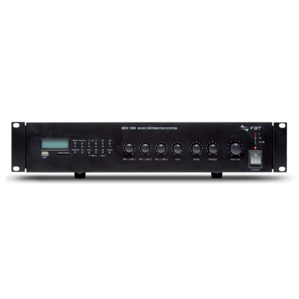 Music Distribution System with Amplifier 60W MDS1060 having Terminal strip for speakers output (25-50-100V/4ohm) and Terminal strip for external 24 Vdc power supply